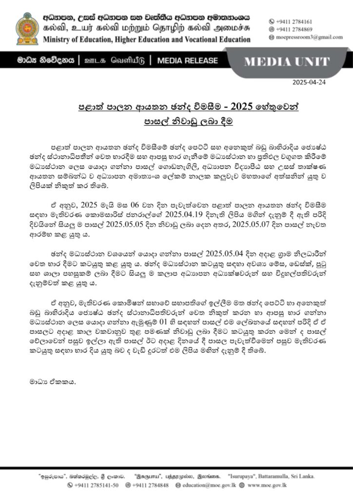 මැයි මස 6 වැනිදා පැවැත්වෙන පළාත් පාලන ආයතන ඡන්ද විමසීම හේතුවෙන්, සියලුම පාසල් මැයි මස 5 වැනිදින නිවාඩු දිනයක් ලෙස අධ්යාපන අමාත්යාංශය ප්රකාශයට පත්කර තිබෙනවා.